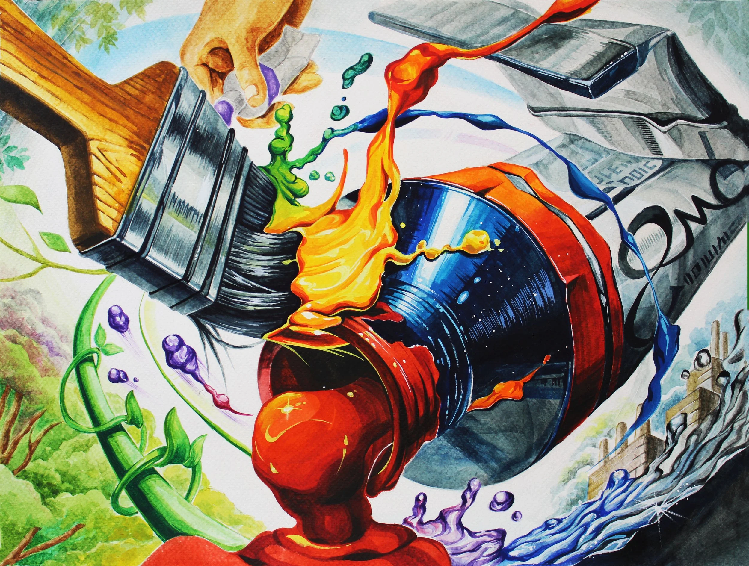 In this piece, the paintbrush and tubes of paint symbolize my dream to change the world through art. With the brush and paint, I want to add life and color to the dull, empty, and barren parts of our world, just how I want to fix the problems in our world with art. The right background, which represents the dirty aspects of the world, contrasts the left background filled with vivid colors. The dirtied background embodies what I want to clean with art.