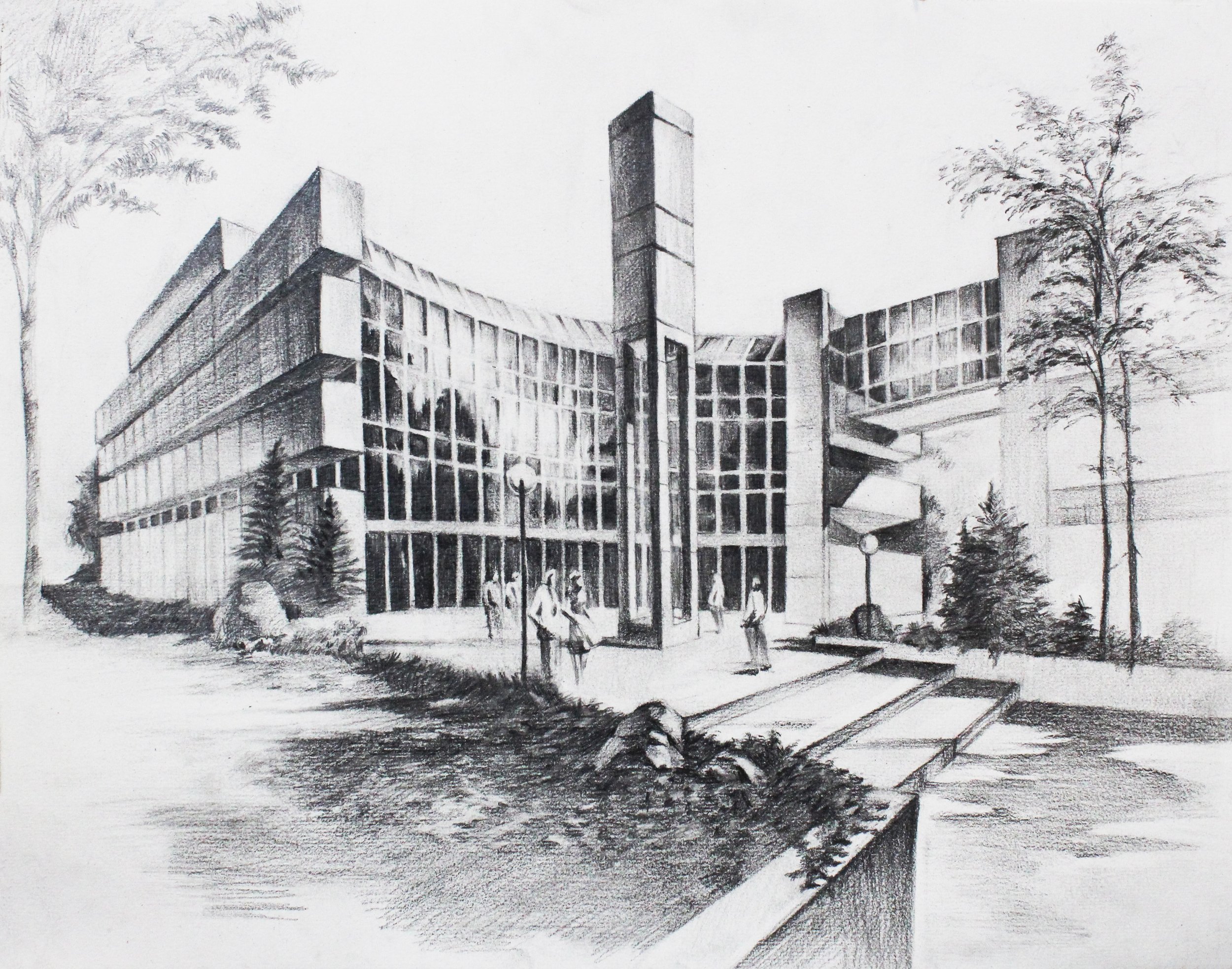 In this piece, I focused on strengthening my perspective drawing skills. I used strong contrast to draw the viewer’s eye toward the center of the composition. Working with curved forms challenged my understanding of depth. This piece also helped me develop greater confidence in understanding how light affects shading with curved buildings.