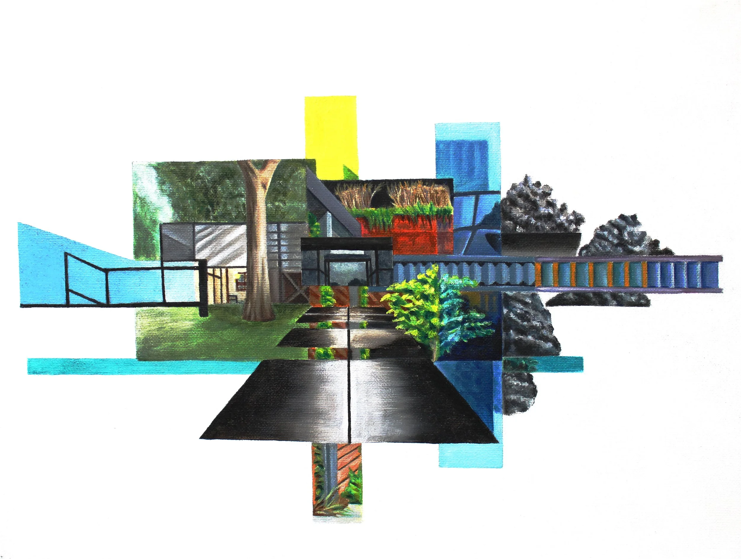 I wanted to study form and find what makes something aesthetically pleasing so I created a collage in the shape of an abstract building. I wanted to explore contrast with area proportions, textures, and color saturation. I used oil paint to create the collage on a traditional canvas. I also used ink and watercolor on paper for some of the images to create a distinct separation from one image to the next.