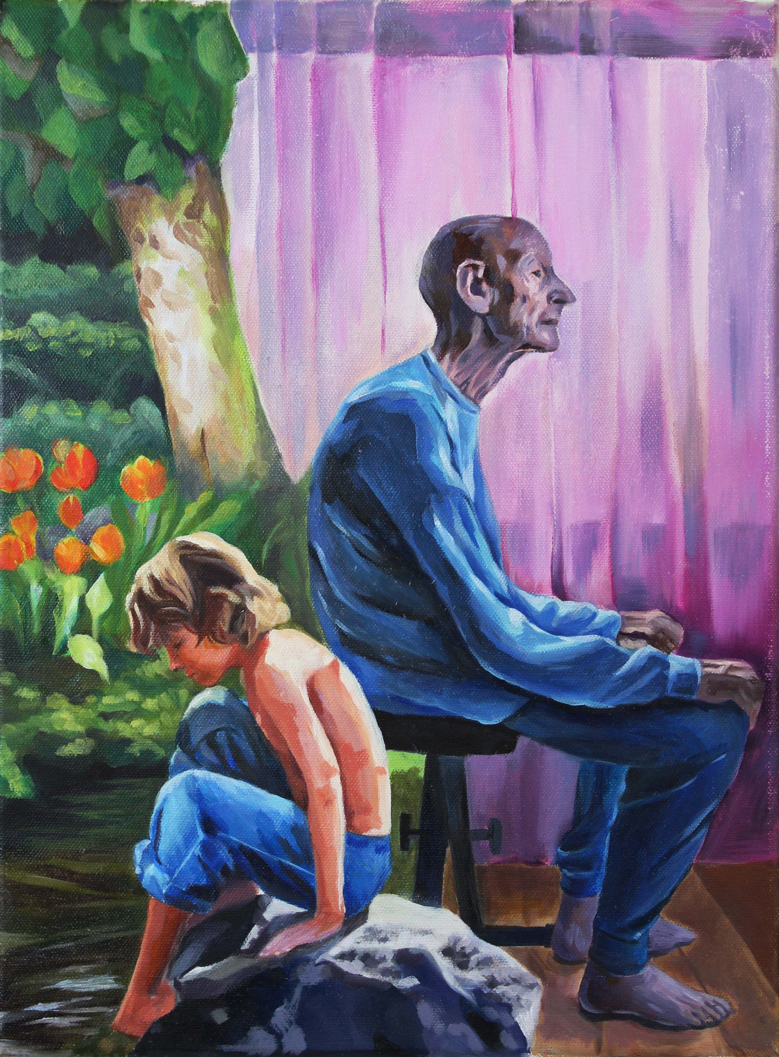 I like to reflect back on my old experiences and relive memories. My past experiences provide opportunities of growth that help me understand myself better. This piece relates to me in a way because the old man is reflecting on his experiences as a young child. This painting highlights the significance of looking back in the past, allowing us to grow as individuals. To show the man imagining himself as a kid, I chose to add an adventurous background for the child and a mundane background for the man.